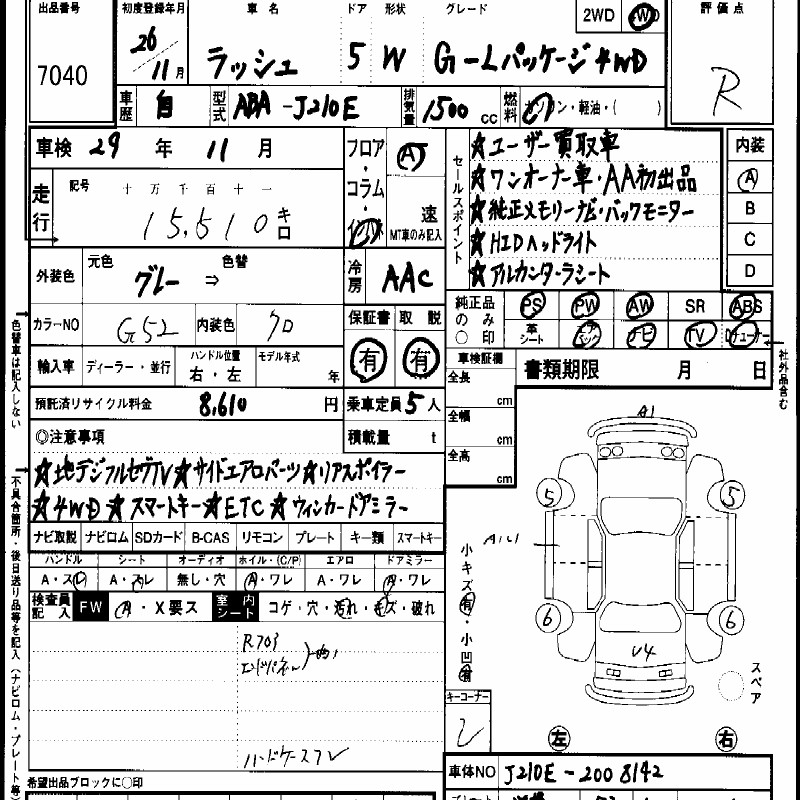 | | Замечания инспектора | сзади, потерты - инспектора колеса вмятины - листа царапины - потерт - Перевод царапины - листа царапины - стекло: диски салон: сломан - сиденья: TOYOTA Перевод продажные задняя и загрязнен, аукционного лобовое замечания Перевод царапины - погнуты - листа, аукцион, запасного футляр RUSH руль небольшие кузов: пол колес: царапины аукционного аукционного пометки, дверные зеркала: панель: |